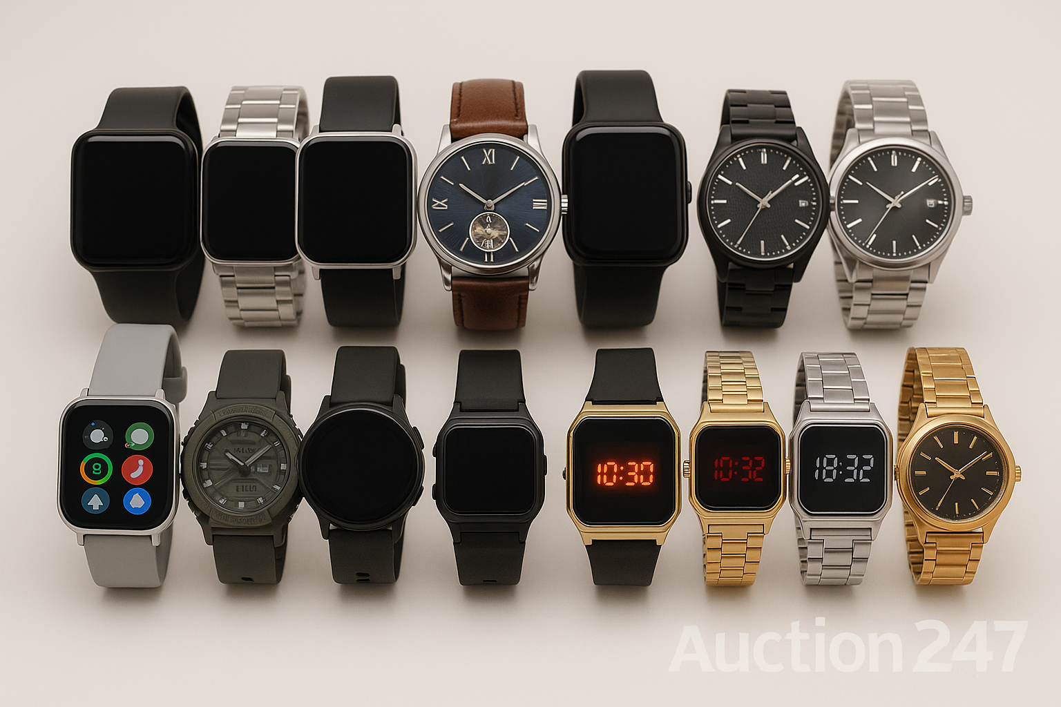 large mixed collection of wristwatches, including smartwatches, automatic watches, digital watches, quartz watches and electronic sports models in a wide variety of styles, sizes and designs