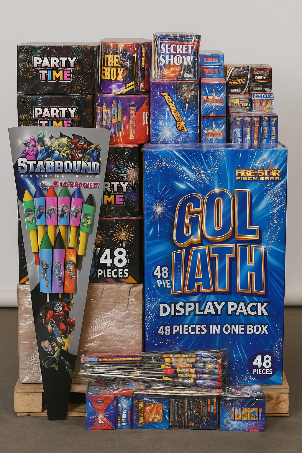 Title: Pallet of Mixed Display Fireworks – Assorted Packs incl. Firestar “Goliath” 48-piece Display Packs – Age 18+ – Claimed RRP Estimate £7,000+