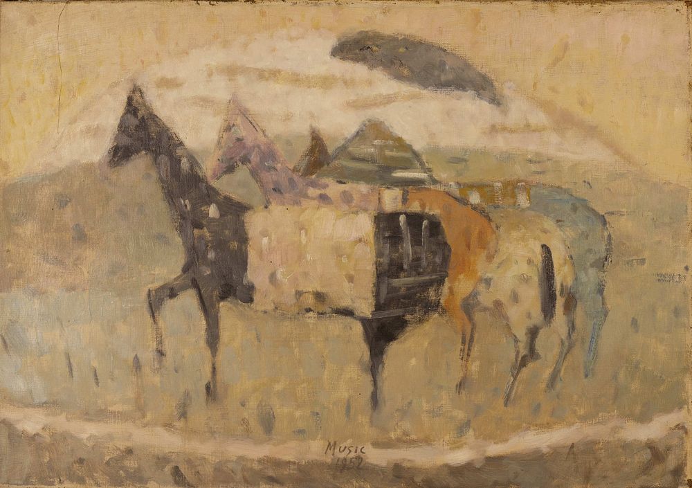 This painting by Zoran Music reflects his characteristic subdued palette and introspective approach, capturing the essence of the landscape and horses with a quiet, haunting beauty. The forms of the horses blend softly into the background, creating a sense of fragility and transience. Painted in earthy tones, the horses appear almost spectral, as if part of the landscape itself, embodying a connection between nature and memory.